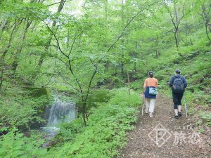 いよいよウォーキングの開始です。まずは星のや軽井沢の集落内の周りから。歩幅を広く(身長からマイナス100cmが理想)、両手をしっかり振って、視線は15~20m先に固定し、深呼吸をしっかりと行います。集落内は下り坂、ゆるやかな上り坂、階段や橋などアップダウンのある地形なので、一周するだけで力を入れる部位が変わってきます。そして歩く内に、木々のざわめき、鳥のさえずり、川のせせらぎなど、周囲の自然も目に入り、体がほぐれていきます。やはり都心の公園を歩くのとはまったく気分が違います。ほんのり汗ばんできますが、それがなんとも心地よいのです。翌日の森林パワーウォークに向けて、心も体もスタンバイOKです!