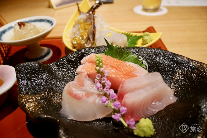 カンパチ、金目鯛、真鯛の刺身に、奥は伊勢海老のお造り。金目鯛と伊勢海老は戸田の塩が甘みが引き立てます。