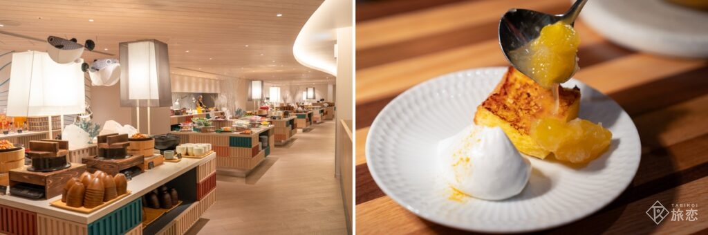 朝食のビュッフェも工夫が凝らされています。ふぐを用いた海鮮丼、ふぐ出汁でいただく山口名物の瓦そば、柑橘をふんだんに使ったフレンチトーストなど、ご当地感たっぷりです。