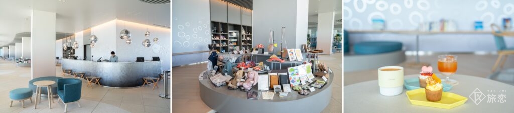 左:フロント、中:ショップ、右:Books&Cafeで購入できるカップケーキとドリンク