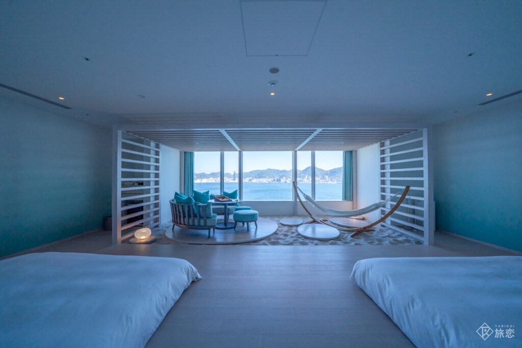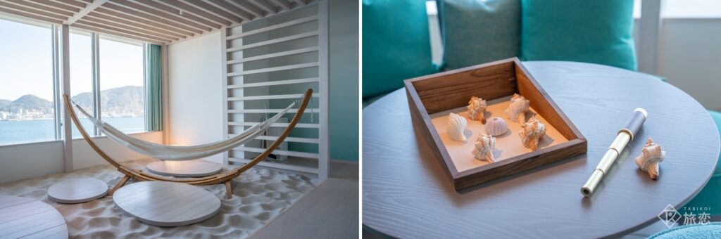 客室は9タイプ全187室あり、基調は海色のエメラルドグリーン、すべての部屋から関門海峡の景色が楽しめるのはもちろん、遊び心も。海峡カバナスイートには、リビングに砂浜が敷き詰められています。室内なのに素足で砂浜を歩く感覚は不思議な気分。またハンモックがあり、望遠鏡や貝殻などのアイテムを詰めた海峡カバナBOXも用意され、ビーチサイドにいるよう。行き交う船を間近にしながら、存分に海峡の眺めを堪能できます。