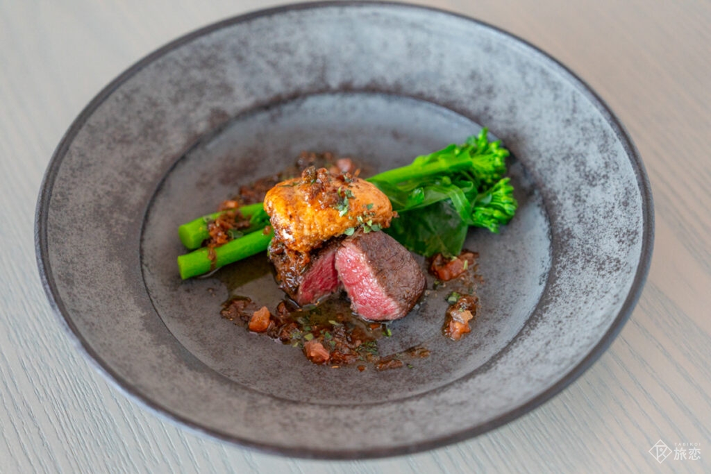 ふぐの白子と牛フィレ肉。赤身肉に白子がぴったり