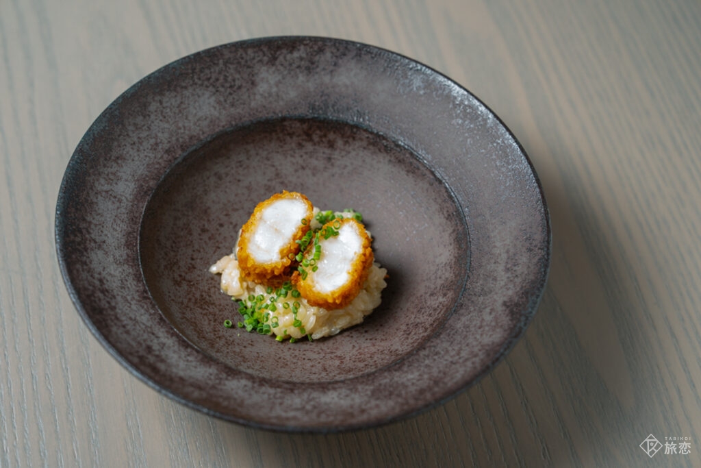 ふぐのフリットと身皮のリゾットは、周防大島の温州みかんの果実酒で