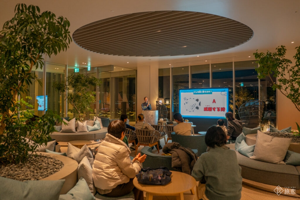 夜8時から開催されるのが海響館講座。ふぐの展示種数世界一という近くにある水族館、海響館をより楽しむための講座です。ふぐの毒は生まれつきではない、ふぐは瞬きをする、体の2倍も膨らむふぐがいるなど、ふぐ博士になれそう。翌日に海響館へ行くのが楽しくなります。