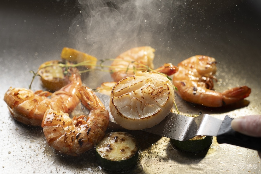 各コーナーは海の幸をテーマにした多彩な料理が並び、出汁をかけたお茶漬け風や、ゴマ風味のコーンに盛り付けた前菜仕立ての一品、海老や帆立を目の前で豪快に焼き上げる「海鮮プランチャ」や鰺フライのライブキッチンなど、できたての味わいを五感で楽しめる、臨場感あふれる食体験を楽しめます。