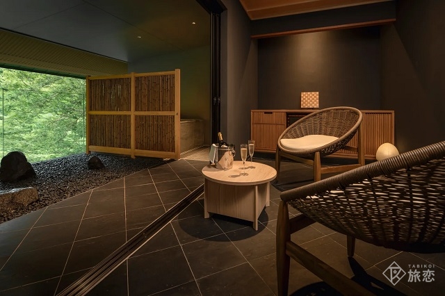 今回のリニューアルで誕生したのが、110㎡を超える2室限定の贅沢なスイートルーム「箱根ごこちスイート」。客室露天風呂、リビングにデスクスペース、床が一段下がったソファースペースを備え、隣接する坪庭付きの湯上がり空間「石の間」で湯涼みも可能です。寝室は独立した2ベッドルームで、最大4名まで宿泊できます。