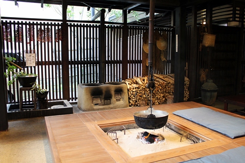 JR信濃大町駅で宿の方に出迎えていただき、車に乗って約15分で宿に到着。かがり火が焚かれた、どっしりと重厚な黒門をくぐると、囲炉裏やかまどが設えられた土間が広がっています。これを目にした途端、田舎へ遊びに来たことを実感! 実際には体験したことがなくても、日本人なら誰しも郷愁を感じる光景です。そばには、湧き水で冷やされた新鮮な野菜が置かれ、辛み味噌や塩で自由に味わうことができます。キンキンに冷えたトマトやキュウリは、普段味わうよりも格別においしく感じるから不思議です。このおもてなし、秋から冬の間は、かまどで蒸した「温野菜」になるそうです。