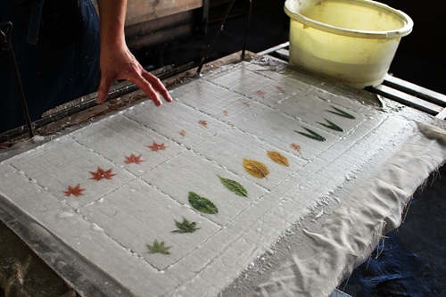 まずは、和紙づくりの工程の説明を受けながら、工房見学からスタートです。素材となる楮(こうぞ)を見せていただきます。皮をはぐと、すでに紙のような質感が見て取れます。これを大釜で煮て、繊維質だけを取り出し、さらに細かく砕きます。「女清水」とこの地で呼ばれている湧水と、楮の繊維質を砕いた原料に、粘性の強い植物トロロアオイ(根をすり潰したもの)を加え、溶液が完成します。溶液の入った水槽で、竹のすだれを一度沈めてから器用に何度も上下させ、溶液がすだれの上を均一に行き渡るように作業を行います。これぞ匠の技! 紙漉きしたものはすだれから外し、独自に処理された木の葉を上にのせます。さらに薄い紙を漉き、木の葉が透けるように重ねます。これを乾燥させれば和紙の出来上がりです。手づくりならではの温かみが伝わってくるようです。