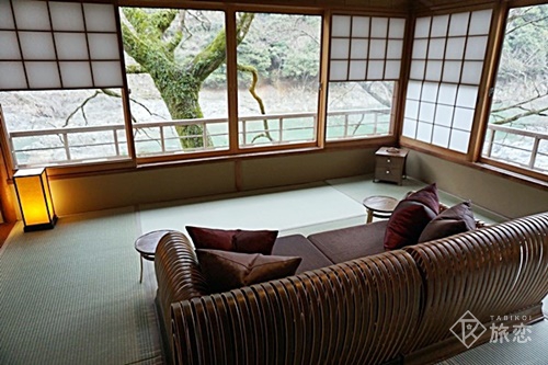 5タイプ25室ある客室はすべてリバービュー。今回、私は「月橋」という広い特別室に滞在しました。畳ソファが置かれた和室からも、窓辺にベンチソファを設えたベッドルームからも雄大な嵐峡の景色を望みます。嵐山の自然の中に身をゆだね、静かな時間を過ごしていると心が洗われていくようです。