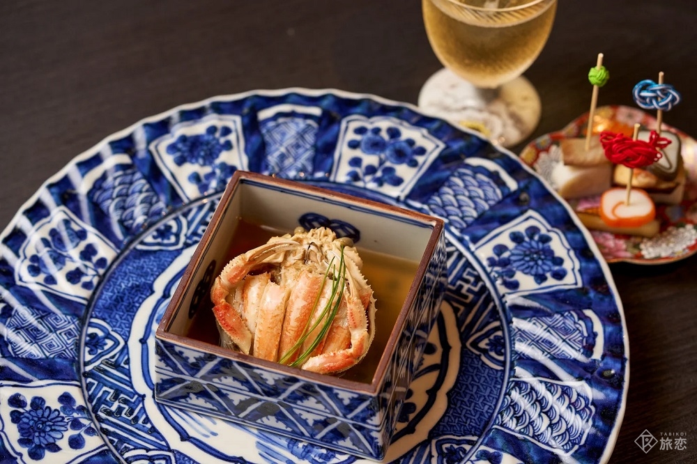 加賀百万石の文化に親しむ温泉旅館「界 加賀」にて、2026年3月15日までの冬の期間、「べんがらラウンジ」にて冬の贅沢な味覚である蟹と九谷焼のマリアージュを堪能できる特別なメニューを提供中です。