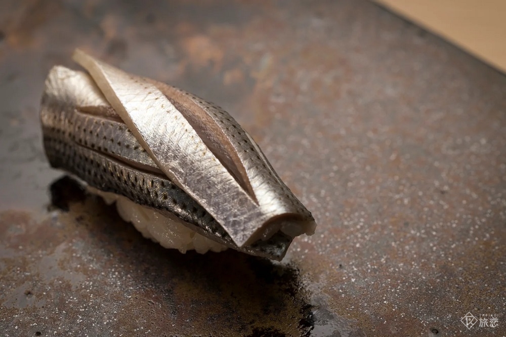 「江戸前鮨」とは、かつて江戸湾(現、東京湾)の魚介を使い、その鮮度を保ち旨味を引き出すために、「漬け」や「煮切り」、「酢締め」といった江戸の職人の知恵と粋が凝らされた握りのこと。寿司ダネには東京近郊に加え、全国各地から届く旬の魚介を厳選。日本各地に根付く鮨文化から着想を得た独創的な握りや、日本料理の繊細な技術を活かした酒肴をコースに取り入れ、伝統の粋を超えた、新しい鮨体験を提案しています。例えば、高菜やひじきを白米で握り、高菜の葉で包んだ和歌山の郷土料理「目張寿司」は、刻んだ鮪トロ、らっきょう、いくらと酢飯を層状に重ねて高菜の葉で包むという、遊び心溢れるアレンジを加えています。