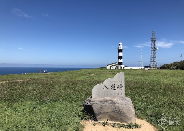 サムアップの指先の部分に当たるのが、景勝地として名高い入道崎。広々とした草原と紺碧の大海原の見事なコントラストに花を添えるのが、入道埼灯台です。