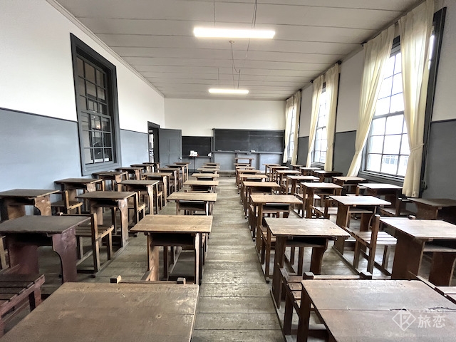 この建物は昭和48(1973)年まで校舎として使用されていたそうで、当時の雰囲気を感じられる復元教室もあります。椅子と一体になった机が整然と並ぶ復元教室は、郷愁を覚える空間。天板の落書きもそのまま残され、高校時代にタイムスリップした気分を味わえます。