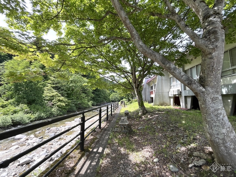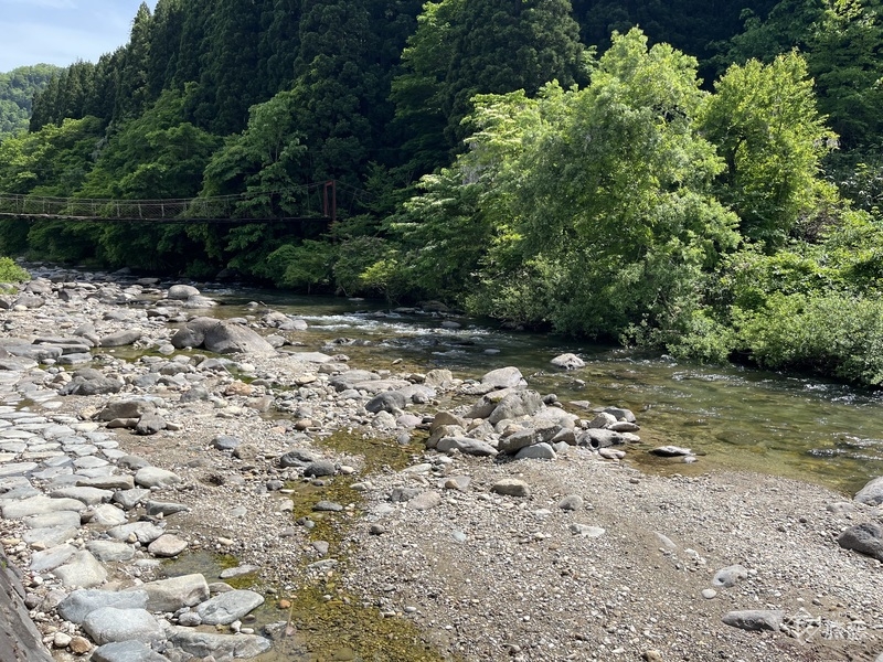 岩魚などの川魚が泳ぐ清流・役内川(やくないがわ)にあるこの温泉スポットは、「川原」という名前がイメージさせる通り、岸辺のいたるところで温泉が自噴しています。石がゴロゴロ転がる川原で温泉が湧いている場所は、温泉藻により緑色に変色しているのですぐ見つけられます。