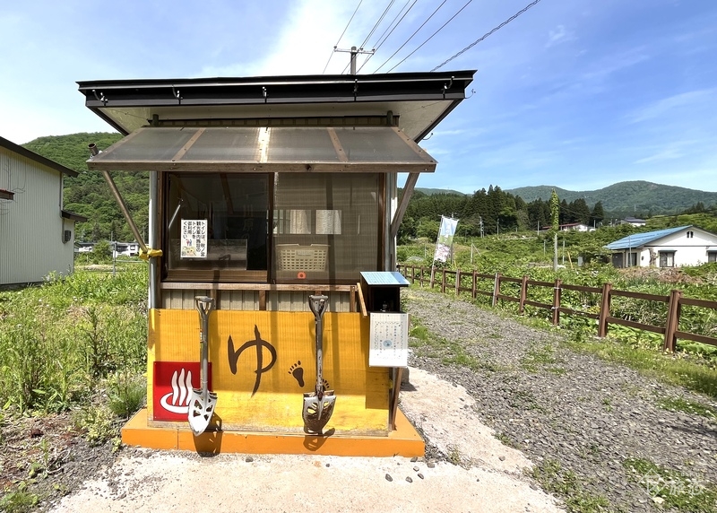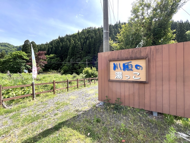 湯沢駅から車で約40分、駐車場に掲げられた川原の湯っこの看板が目印。