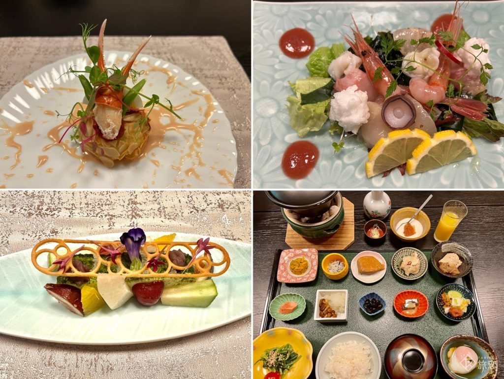 夕食の前菜とサラダとデザートと朝食。