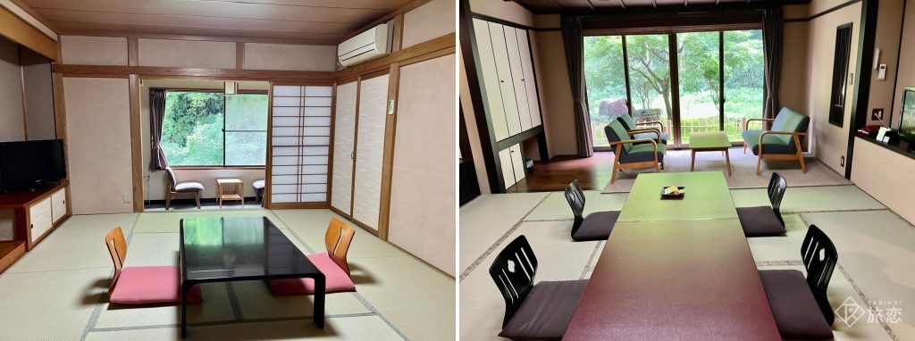 通常和室(左)とリニューアルした和洋室。温泉浴室付きの特別室もあり