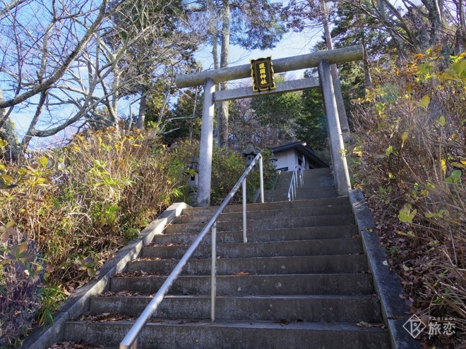 登り切ると、河口湖〜富士山パノラマロープウェイの山頂駅「富士見台駅」に到着。多くの人で賑わっていますが、天上山の山頂はここから10分ほど山道を登ったところにあります。山頂は木々に覆われて見晴らしがなく、小御嶽神社の祠があります。