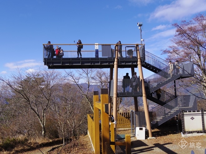 富士見台駅から山頂方面に少し進んだところにある大きな展望台が「絶景やぐら」。階段を上ってやぐらの先端に立つと、左右に裾野を広げた富士山がひときわ美しく眺められます。