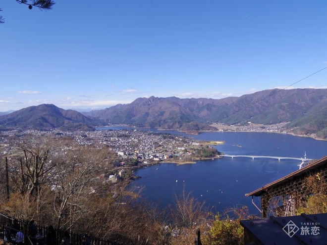 ロープウェイ乗り場付近からは河口湖や、その周辺の山々がきれいに眺められます。湖の景観を楽しみながら、約3分の空中散歩で山麓駅に到着します。山麓駅からは河口湖駅へ路線バスがありますが、湖畔の散策を交えながら、歩いて河口湖駅に戻ってもよいでしょう。