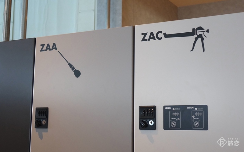 ロッカーには、飛行機のメンテナンスに使用する工具のイラストや空港コードがあしらわれている