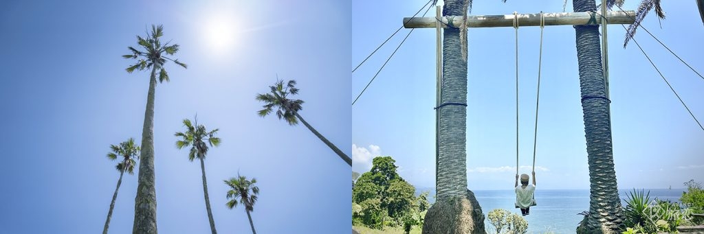 青い海を左手に見ながら、しばらく歩くと緩やかに山道へ。「PICA初島」のエリアに入って行きます。坂道を登り、階段を上がると緑の芝生が敷き詰められた「アジアンガーデン R-Asia」に到着。椰子の木が立ち並び、一気に南国気分が盛り上がります。ハンモックに揺られたり、大海原に飛び出していくようなブランコを楽しんだり、冷たい飲み物片手に思い思いの時間を過ごすことができますよ。