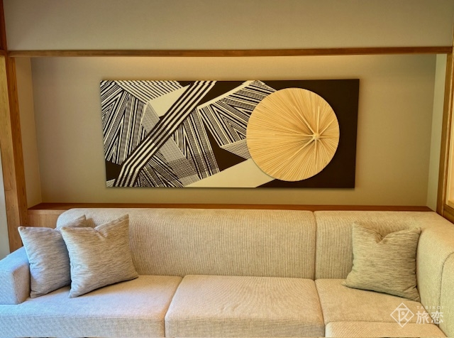 2025年8月にリニューアルオープンした界 箱根のご当地部屋。ウォールアートは三度笠と引廻し合羽がモチーフ
