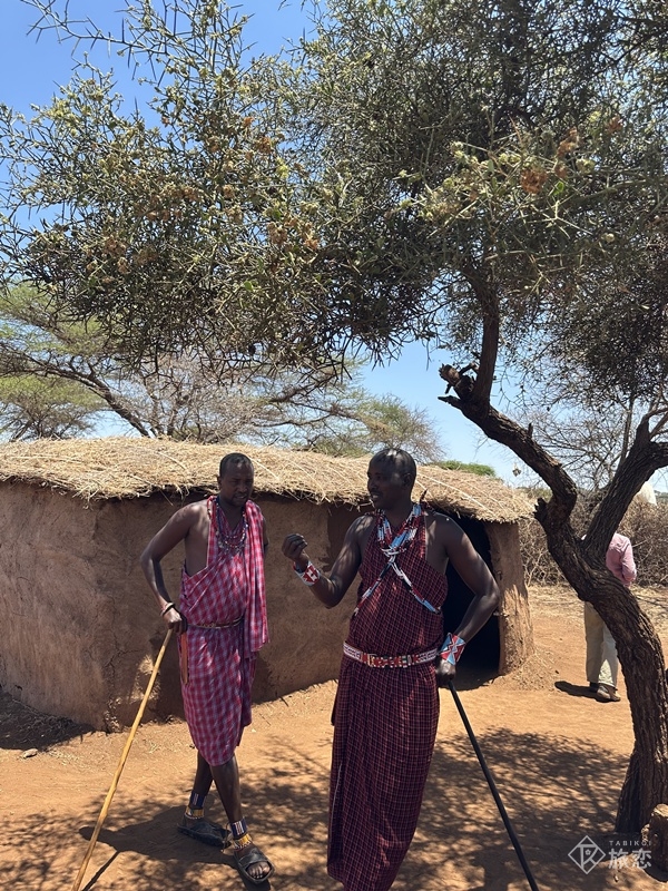ナイロビのホテルを朝7時半に出発、4時間の道中は舗装されていない道路が多く、砂埃が舞い、マスクが欠かせません。途中休憩が1回。さらにお土産物屋さんに30分…は長い。お昼近くになり、砂地のサバンナが続く中、訪ねたのはマサイ族の村。車を降りて村に近づくと、マサイの若者がジャンプをする歓迎のダンス。身体能力の高さを感じます。手を繋ぎ、一緒にダンス。その後、村の仕組みや家のなかを見せてくれます。