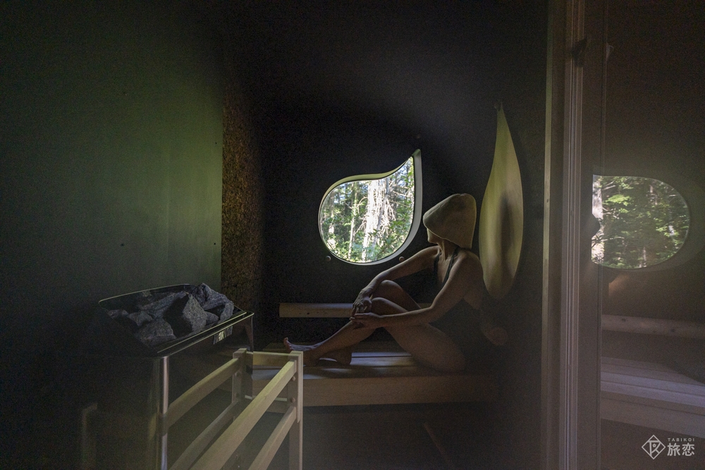キャビンの敷地内に部屋と並んで設置されたサウナは、同時に2名まで利用可能な静かな空間。唯一ある小窓からは外の光が入り込み、朝昼晩でその表情を変えます。その空間自体が瞑想のために整えられたようで、時の流れを忘れるひとときでした。サウナから出ると、森の凛とした空気を一杯に吸い込み、自然との一体感をより深く味わえます。