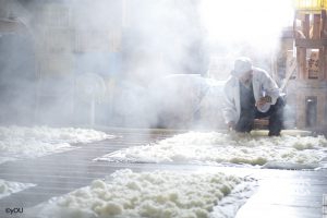 2階の枯らし場で待ち構えていた従業員の手により紐で引っ張り上げられたザルはひっくり返されて、麹米はあっという間に床に広げられていきます。真っ白な湯気が立つ空間には何台もの扇風機。ここで一気に冷却するのです。