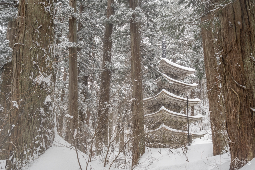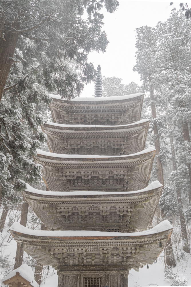雪は本来視界を奪い情報を減らすものですが、静かな杉木立の中に五重塔という存在だけを際立たせていたのです。圧倒された私は、写真を撮る前にしばらく見上げてじっくりとその佇まいと対峙。雪が降り続くことで、その時間さえも緩やかに感じられました。