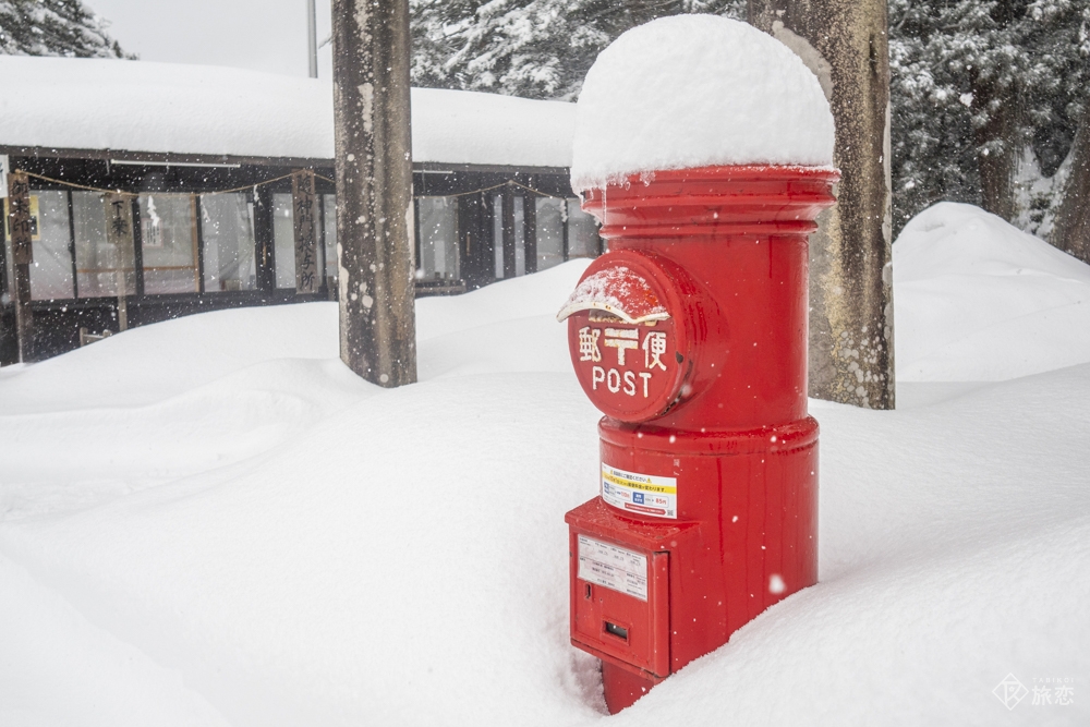 鳥居横のポストにも雪帽子。白い世界に赤が映える
